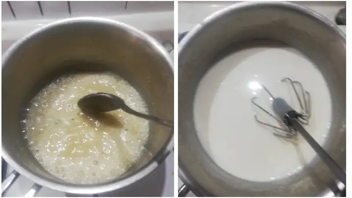Beşamel sos için unu yağla kokusu çıkana dek kavuruyoruz ve sütü ekleyip koyulaşmasını bekleyip kaynayınca ocağı kapatıyoruz.