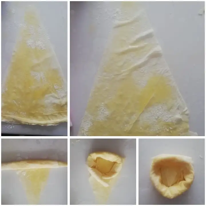 Ben yufkaları kestikten sonra sosladım siz sakın ha öyle yapmayın, benim gibi pişman olursunuztek kat yufkayı sosladıktan sonra süzgeçle üstüne biraz nişasta gezdiriyoruz. Ve ikinci yufkayı seriyoruz. Aynı işlemi tekrar yapıp resimdeki gibi şekil veriyoruz.