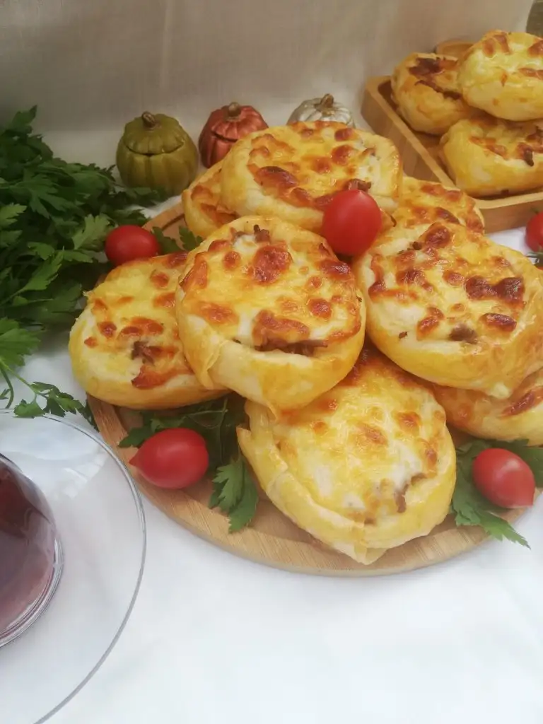 Hazırladığımız çanakların içine önce iç harcı sonra beşamel sosu koyuyoruz. Üstüne kaşar peynir serpiyoruz. Yufka nın kenarlarına yumurta sarısı sürüp fırına veriyoruz. Kaşarlar eriyip kızlarınca fırından çıkarıyoruz. Afiyet olsun :)