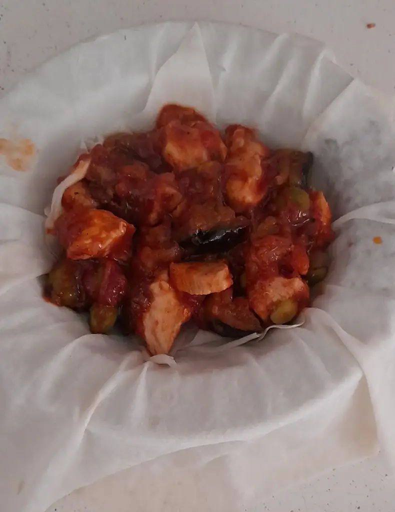 Salça,tuz,karabiber ekleyip kavurmaya devam ediyoruz.Suyun çekince altını kapatıyoruz.Yufkaları 4'de bölüyoruz.Kasenin içine yerleştiriyoruz.