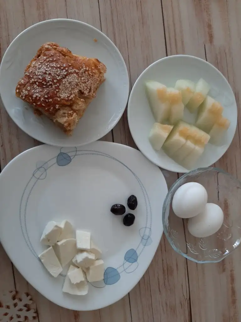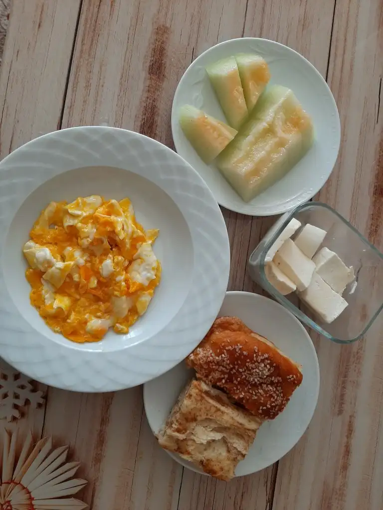 Okuldan geldim nasıl acıkmışım Hemen tereyağında yumurta ,kavun peynir haşhaşlı çörek ile öğlen yemeğimi hazırladım