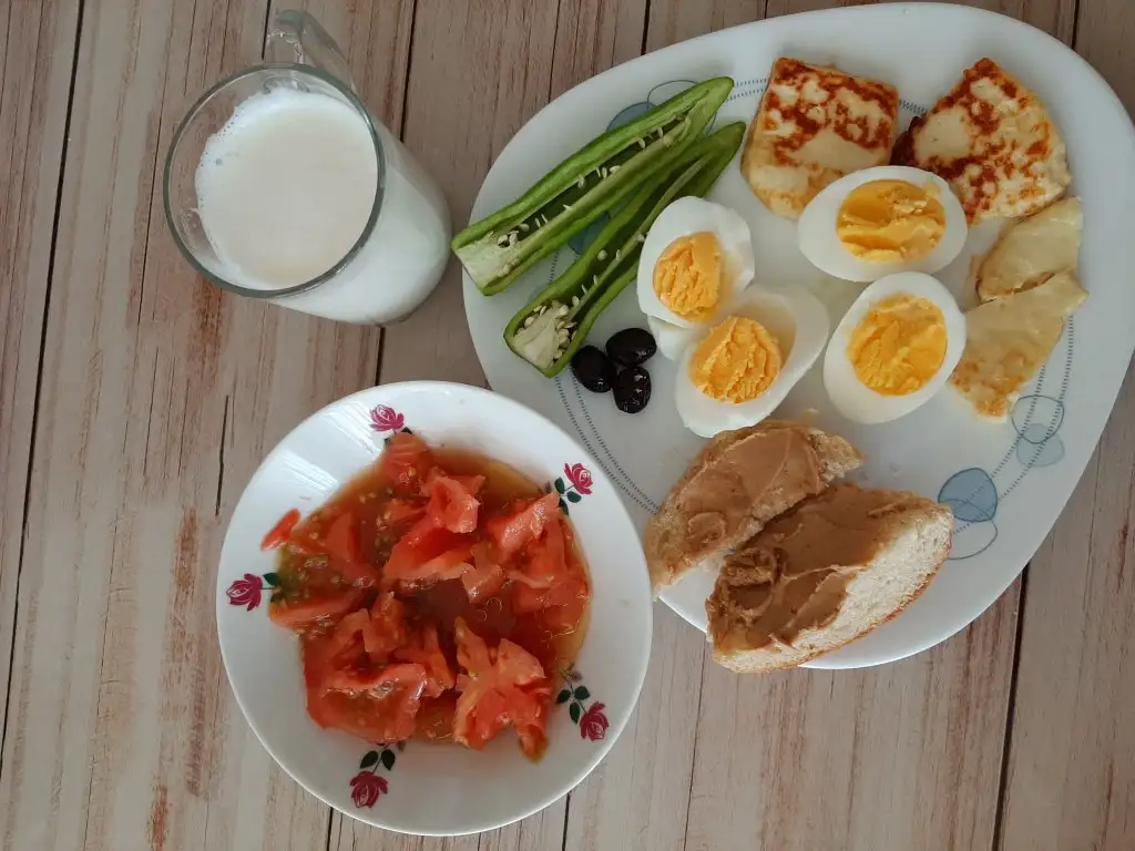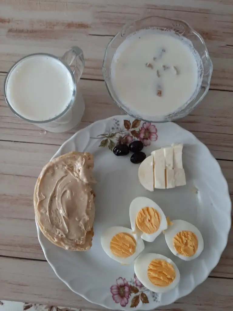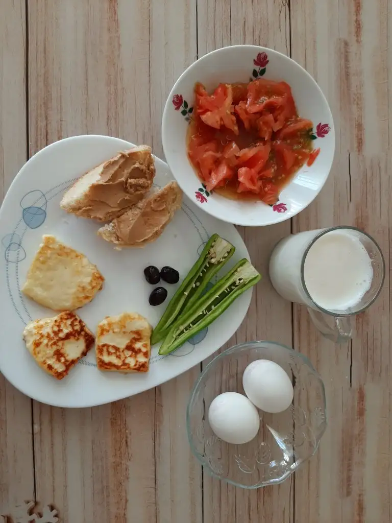 Kahvaltım 200 ml süt 2 yumurta 3 zeytin 3 dilim peynir kızartması 1 yeşil biber 2 minik parça hamburger ekmeği 1 tk fıstık ezmesi 1 domates + 1 yk zeytinyağı