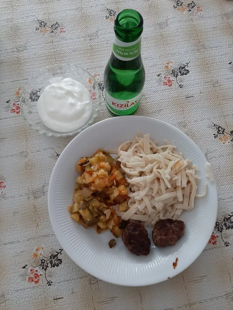 Akşam yemeğim 4 köfte 2 servis kaşığı bamya yemeği 2 servis kaşığı makarna 1 kase yoğurt 200 ml vişne kompostosu