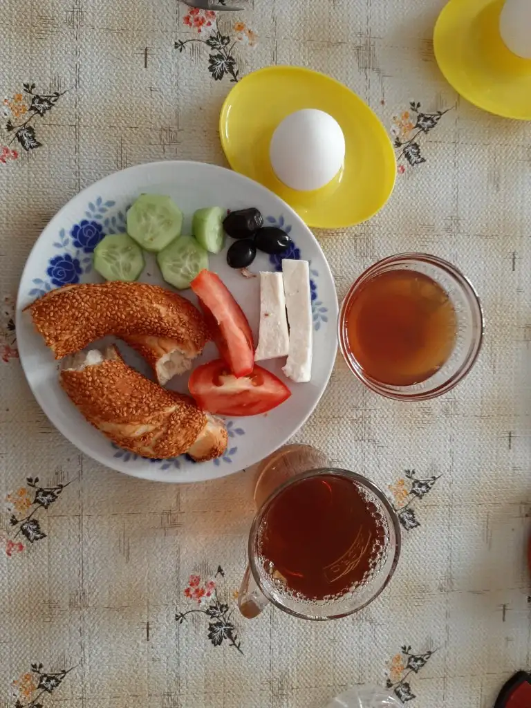 Kahvaltı öncesi 1 yk tahin 1ceviz +200 ml su Kahvaltım 1 yumurta 1/2 simit 2 dilim peynir 3 zeytin 4 dilim salatalık 2 dilim domates 1/2 salatalık 2 tk bal 200 ml şekersiz çay