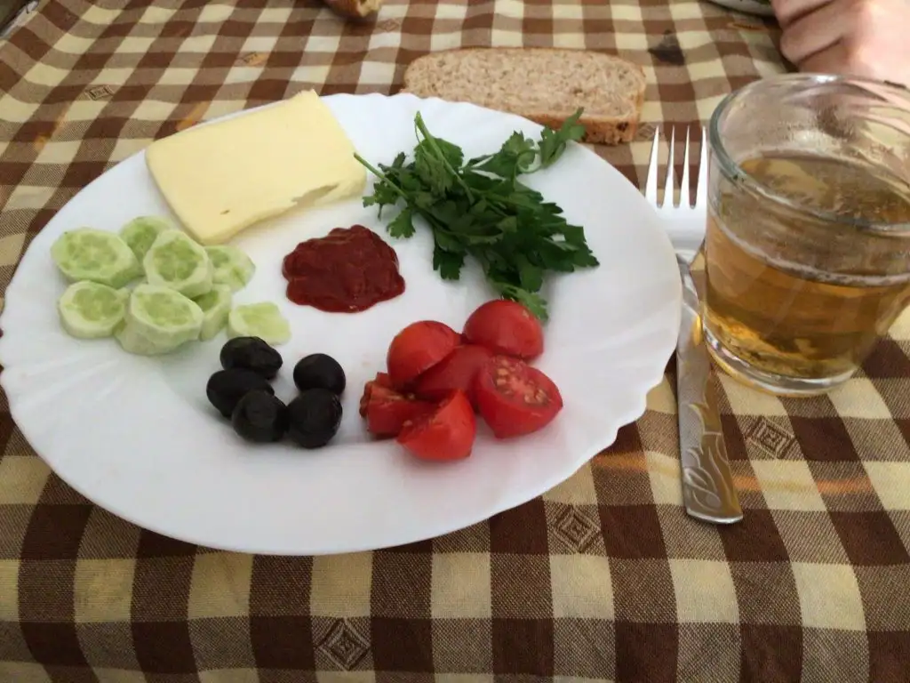 1 Dilim peynir salatalık domates maydanoz beş zeytin bir dilim ekmek yeşilçayİki yumurta