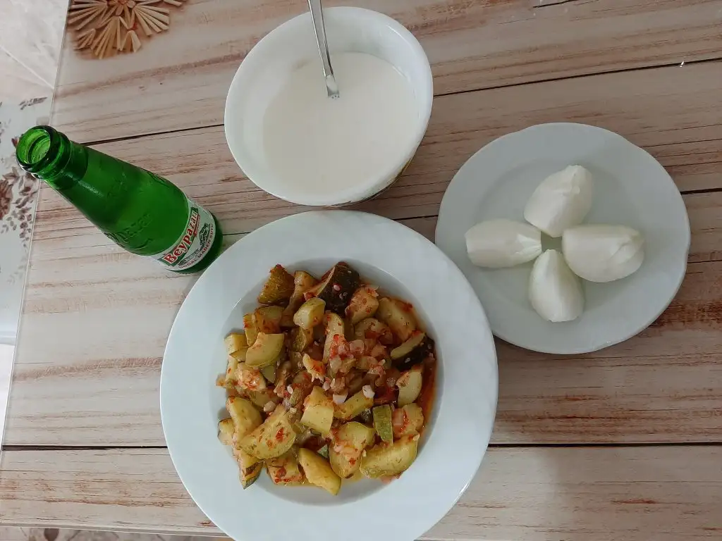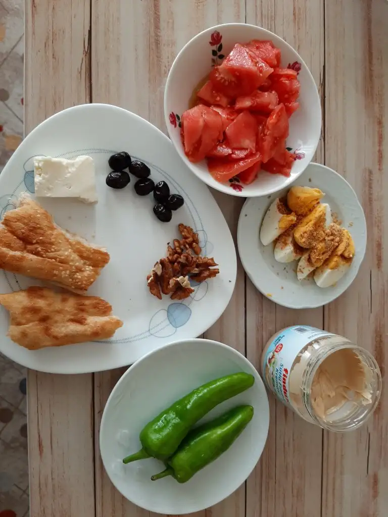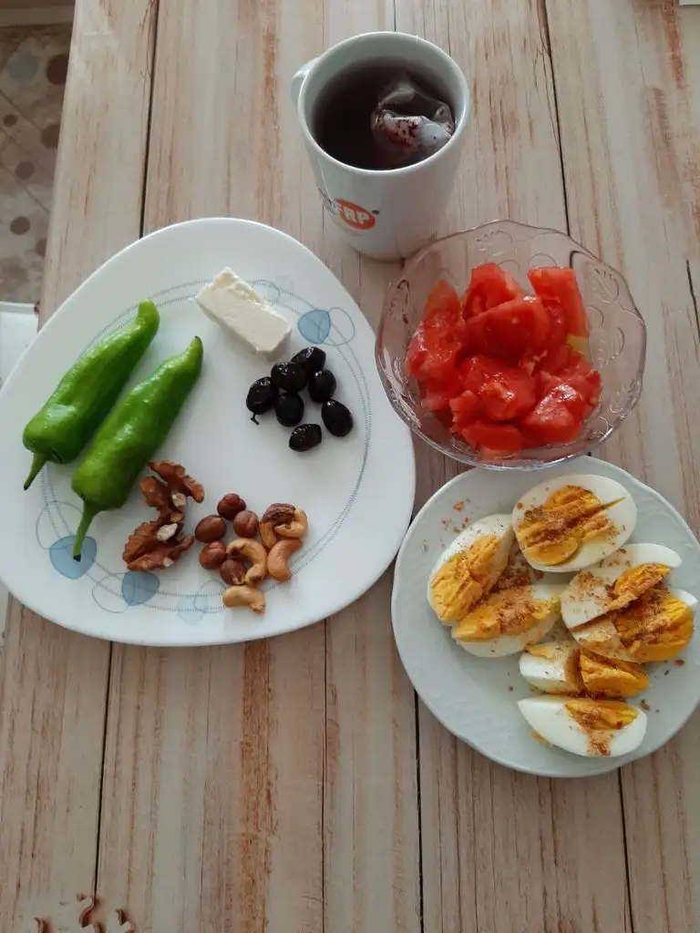 Ben de kahvaltıda kabaklı yumurta, sepet peyniri, beyaz peynir, yeşil zeytin, çiğ çerez, siyah kuru üzüm, marul, maydanoz yedim.