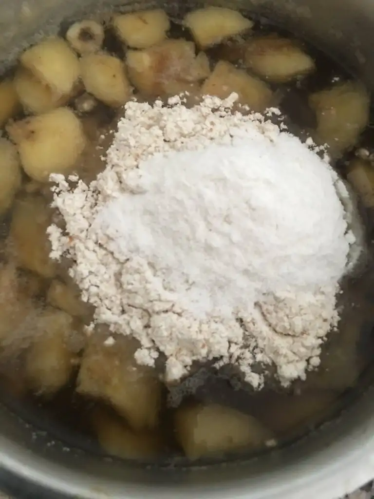 Malzemelerimiz tamamen yumuşadığında pirinç ununu ve tam buğday ununu ekliyoruz.