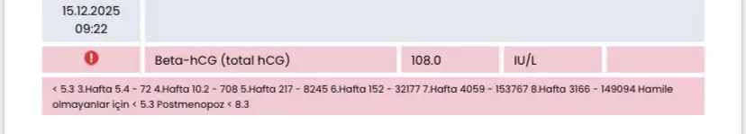 Dün gece acile gittik bazı tahliller yapıldı antibiyotik için de betama bakmak zorunda olduğunu söyledi çünkü reglim 1 gün geciktiğini söyledim betam bu sabah çıktı 108 çıktı normal mı sizce hamilelik var mı