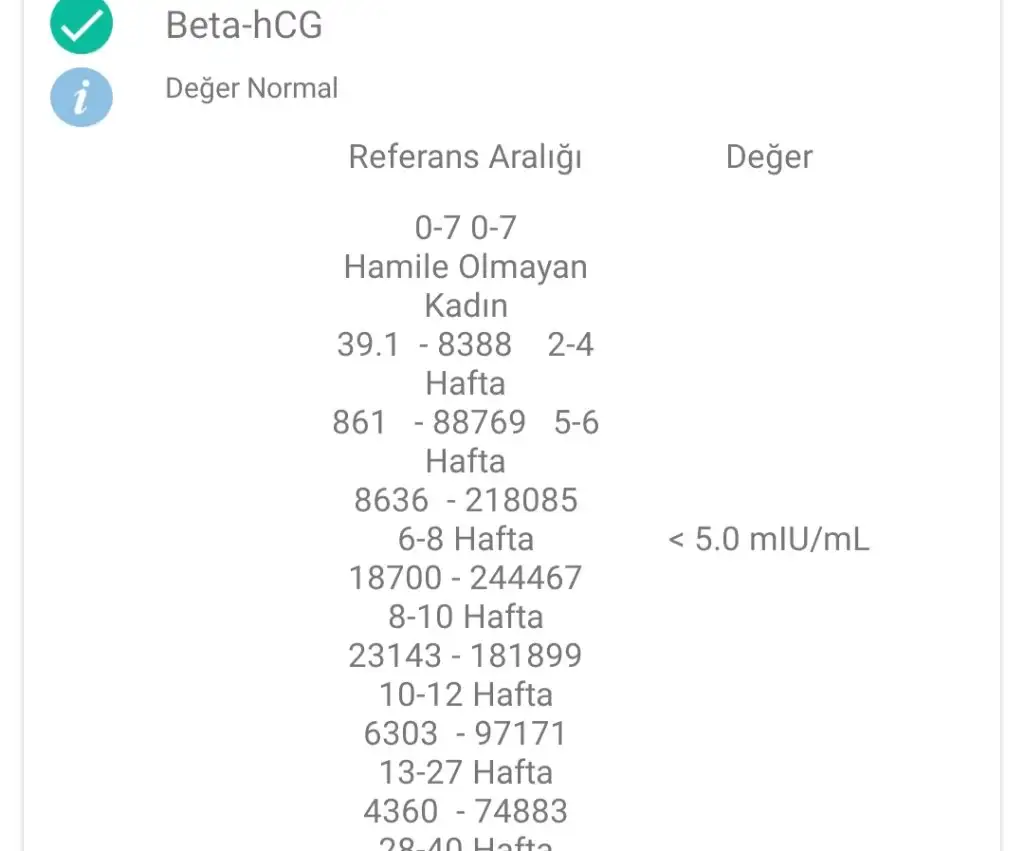 Resmini eklesene sonucununBen tesadüfen yaptırdım beta testini <5.0 çıktı ama değerlerin olduğu yerde o kadar fazla açıklama varki ne olduğunu anlayamadım adetimi sadece 1 gün geçtikten sonra yaptırmıştım kan testini yarın gösterecz tahlilleri ama ne demek bu