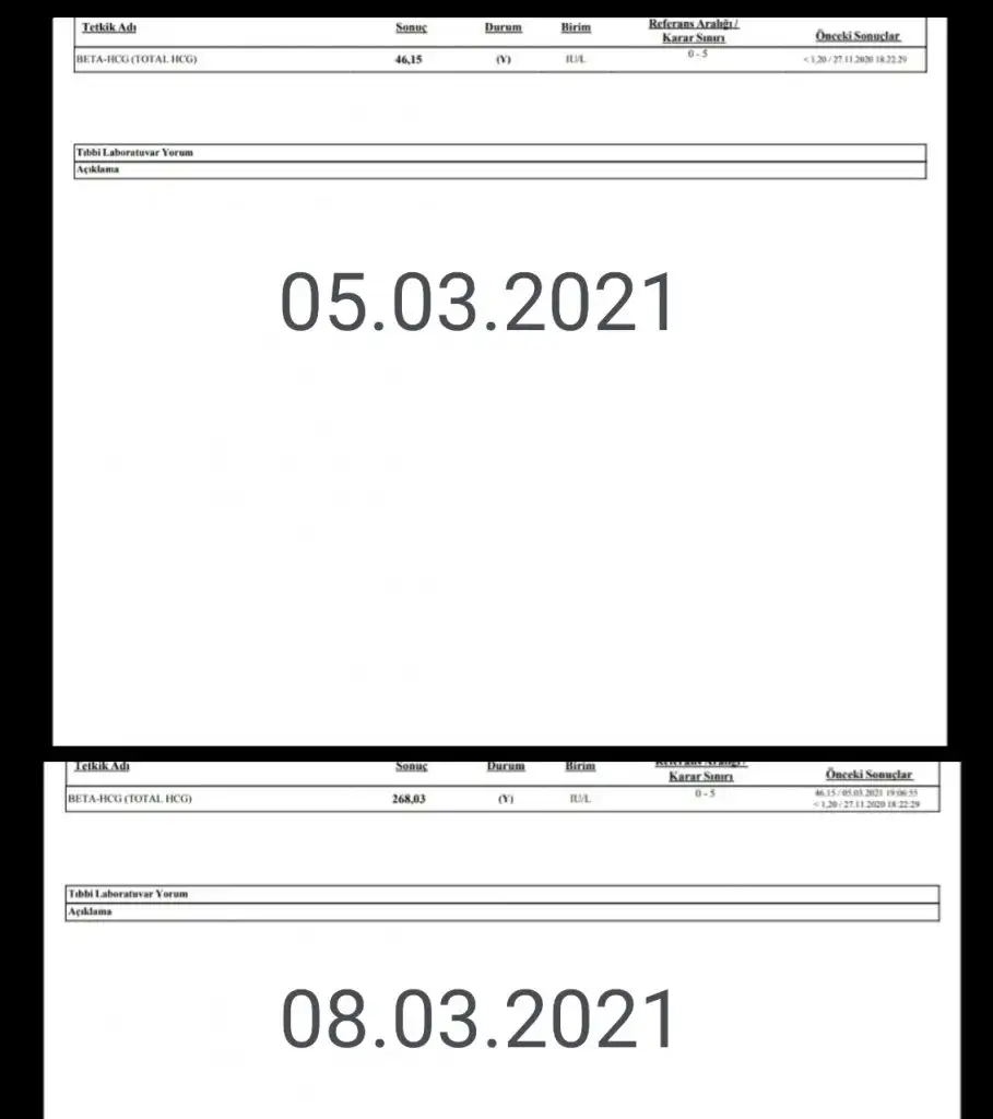 Kızlar merhaba , ben adetime 6 gün kala 05.03.2021 tarihinde kan testi verdim sonucun 45.16 çıktı. Bugün adetime 3 gün kala tekrar verdim 268.03 çıktı. Normalde 2 katı artması gerekirken Benim ki 3 günde bayaa artmış gibi geldi sizce riskli mi