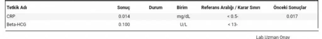 Arkadaşlar merhaba. 2 ay önce ilişki yaşadım ve ilişki sonrası hep adet sonrası gelen kahverengi akıntı adetten önce geldi. Bunun üzeribe doktora gittim beta hcg ve ultrason yaptırdım negatif çıktı. Sonraki ay tekrar beta hcg yaptırdım yine negatif. 15 gün sonra beta hcg ve ultrason yaptırdım. En son beta testini sizinle paylaşıyorum. Bu sonuca göre hamile miyim? Ve 2 ay içinde beta ortalama olarak kaça kadar yükselmesi lazım? Sonuçlarım hep negatif fakat kafamı karıştıran şey internette betayı adet gecikmesinin 2.günü yaptırın yazıyor. Ben hiç adet gecikmesi yaşamadım ve testleri genelde adetten sonra veya önce veya adet zamanında yaptırdım. Şayet hamileysem 2.ayımda olmam lazım burada beta değeri güne göre bu kadar(0.100) düşüklük gösterir mi?