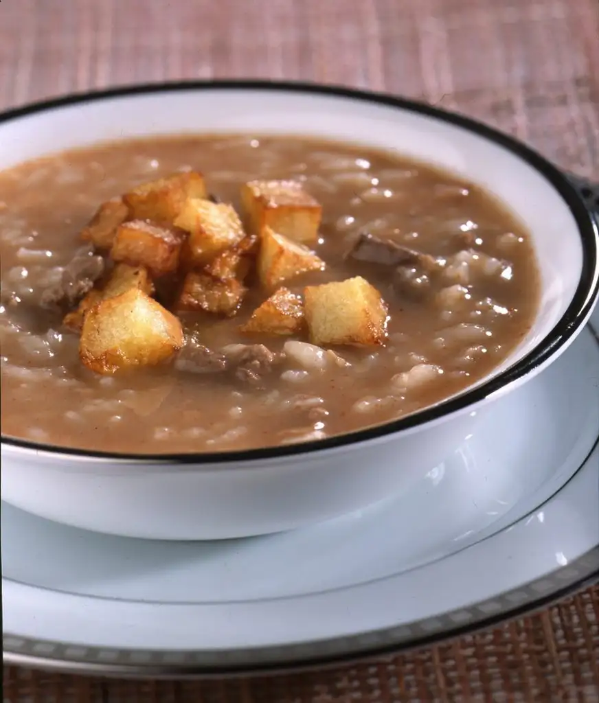 Tavuk ciğerini küçük küçük doğrayın. 6 bardak tavuk suyunu tencereye alıp 1 kaşık margarin ilave edin. Pirinci yıkayıp süzün ve kaynamakta olan tavuk suyuna ekleyin. Pirinçler hafif hafif yumuşayınca doğranmış ciğeri ilave edin yumuşayıncaya kadar pişirin. Patatesleri soyup küçük küpler halinde doğrayın. 1 kaşık margarini tavada eritip patatesleri kızartın. 1 kaşık unu 1 çay bardağı suyla karıştırın. Kaynamakta olan çorbaya sürekli karıştırarak ekleyin. Sirke, tuz ve kızarmış patatesleri ilave edip 5 dakika daha pişirin. Kırmızı toz biber serpip sıcak olarak servis yapın.