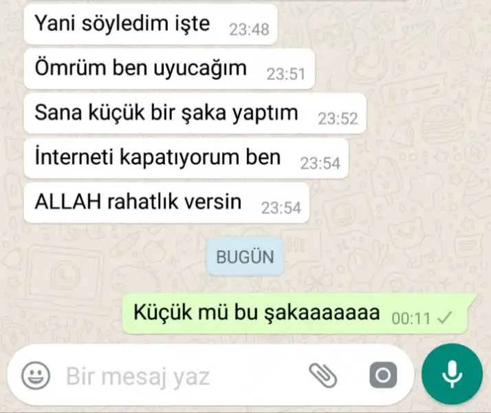Vatandaşın yaşı kaçBu arada şaka yapmış dengesiz benim huyumu biliyor ya stresliyim nişan heyecanı derken pek aramıyordum o arayıp duruyordu pek arayan mesaj atan birisi değilimdir. Fitili verdi sonra izledi uyumadan da şaka yaptım dedi![]()