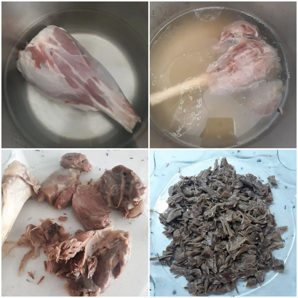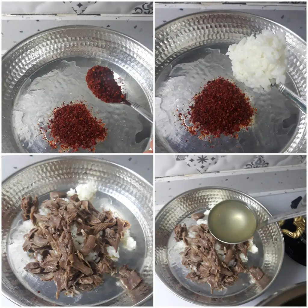 Önce etimizi düdüklü tencereye koyup bir guzel haşliyoruz.Daha sonra pişen etlerimizi bir tabaga alıp didikliyoruz , sonra pirinclerimizi yikayip 2 cay bardagi su ekledigimiz tencereye ekliyoruz ve pismeye birakiyoruz.