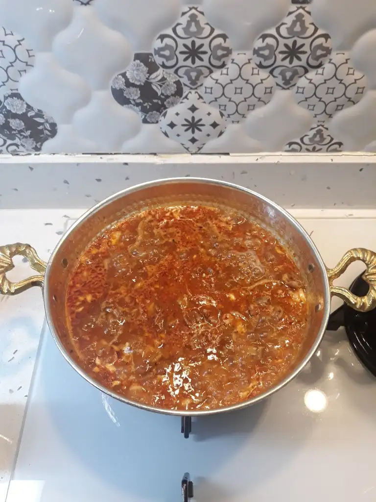 Bir tavaya et suyunun yuzundeki yagdan 1 yemek kasigi tavaya ekledim daha sonra pul biberimizi pilavimizi ve en uste etlerimizi dizdim ocagin altini acip et suyumuzu ekledim kaynamaya baslayinca karabiber , tuz ve sarimsagimizi ekleyip kaynattim ve iştah kabartan şifa dolu çorbamizi sunuma hazir hale getirdim o zaman gelelim sunumumuza😋😋