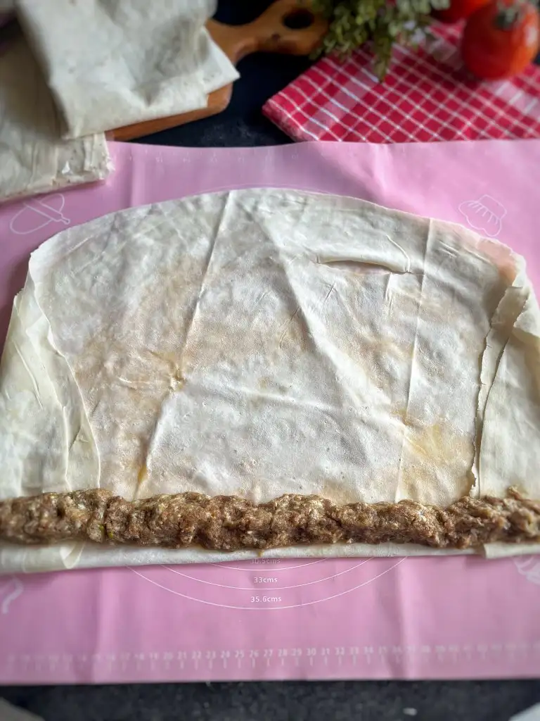 Köfte harcını 2 ye bölüp 1 kısmını yufkanın bir ucundan diğer ucuna yerleştirelim.