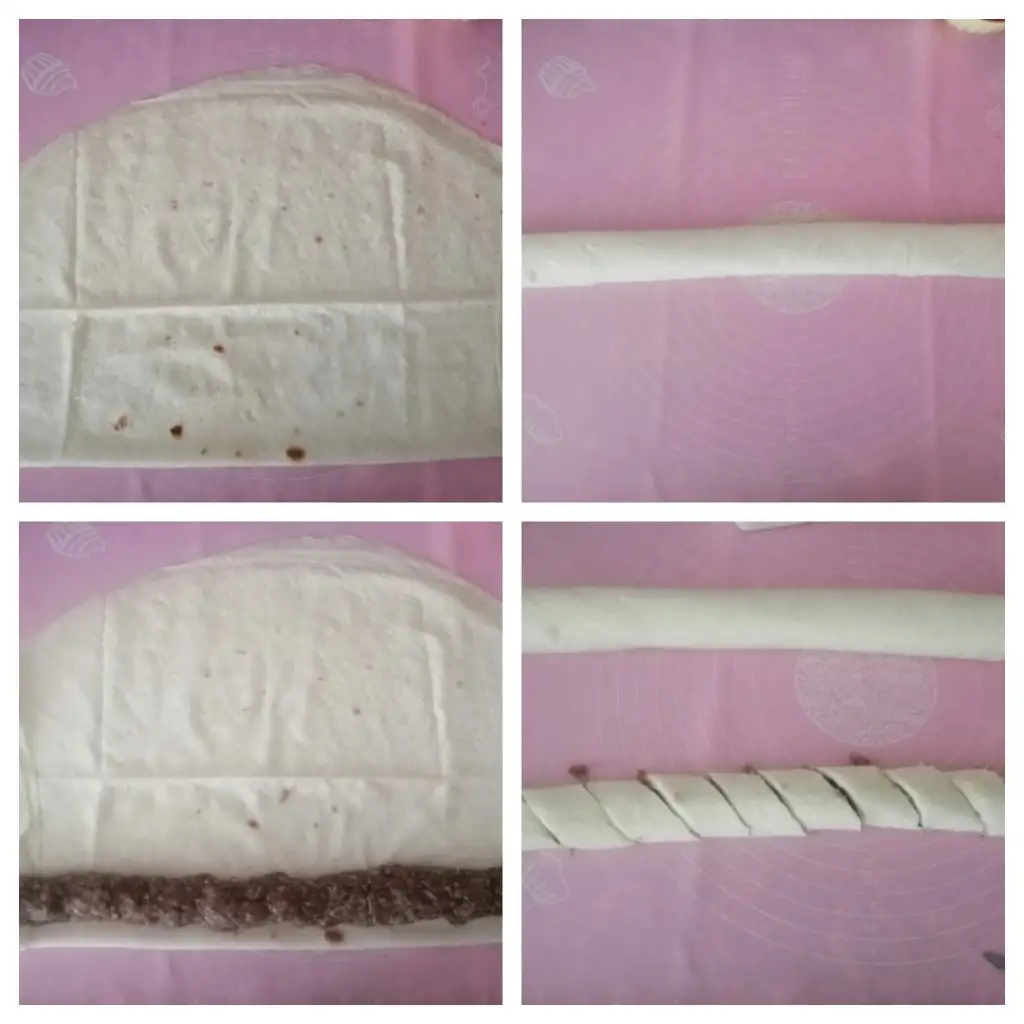 1 yufkayı ortadan 2 ye katlayıp D şekilde kapatalım. Kenar kısımlarını içe doğru katlayıp 2 ye böldüğümüz kıymayı silindir şeklinde uçtan uca yerleştirelim. Diğer yufkayı da yapıp verev şekilde keselim.