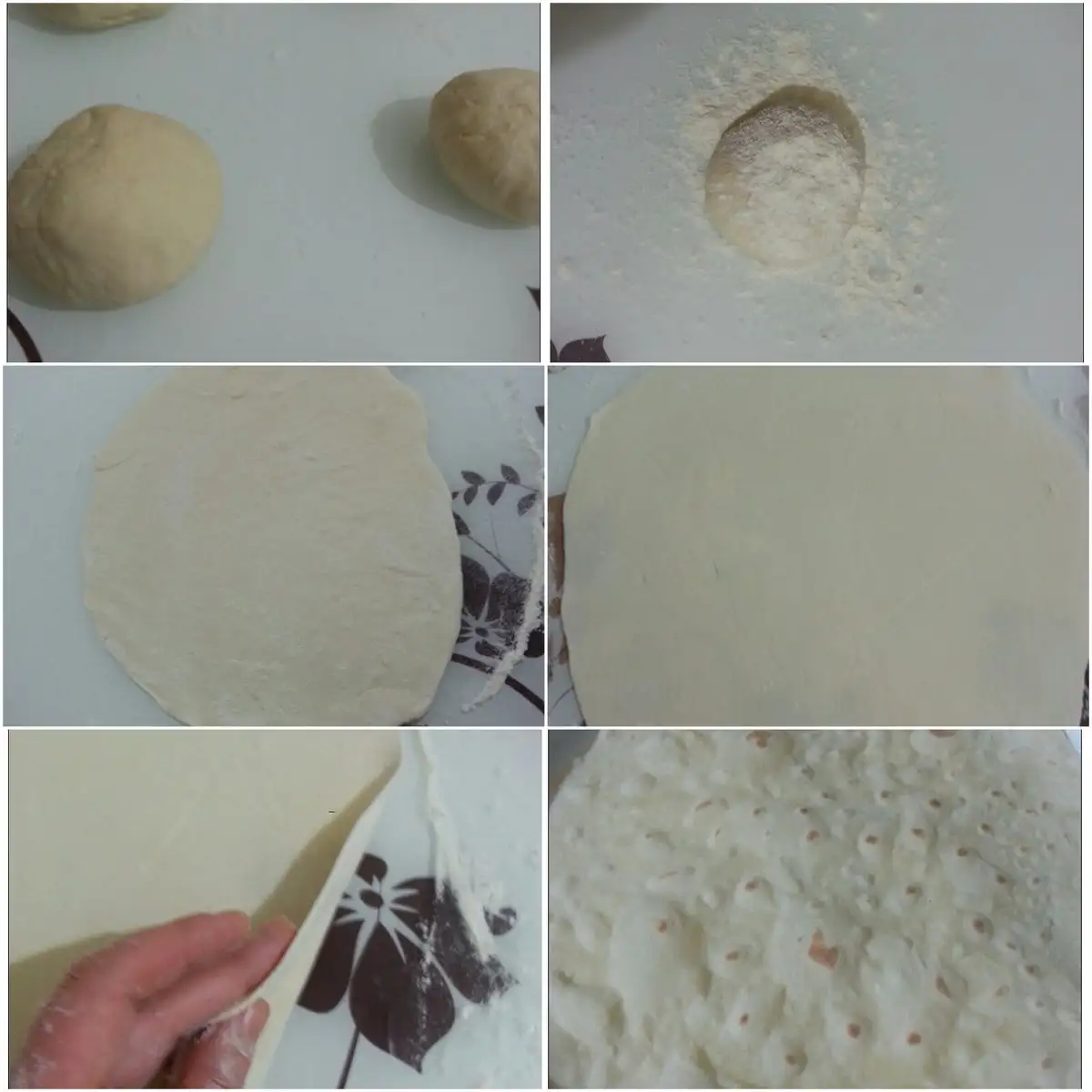 Dinlenen hamuru 4 eşit parcaya bolun. unlayarak Bezeleri acin. İnce olmasina dikkat edin mutlaka.Fotografa inceligini ekledim.Yanmaz yapismaz tavada onlu arkalı pisirin. Tavaniz büyük olmali.