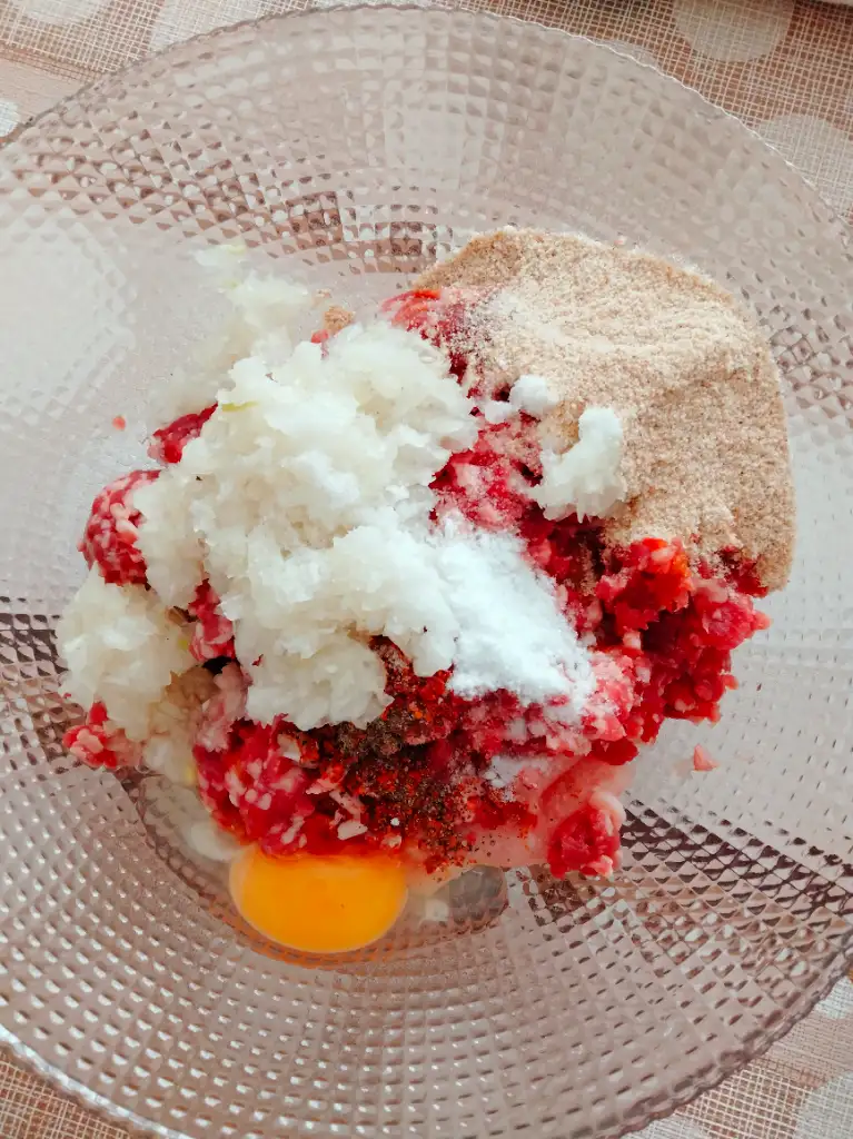 Kıyma, yumurta, tuz baharat, galeta unu, soğan bir kaba alınıp yoğurulur.