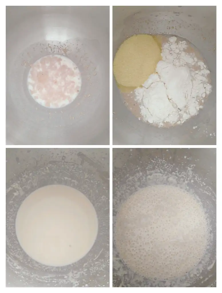 Önce maya, süt, su, tuz ve şekeri karıştırıyoruz. Üzerine un ve irmiği ekleyip karıştırıyoruz. 1 saat kadar mayalanmaya bırakıyoruz. En az 20 dakika mayalansın.