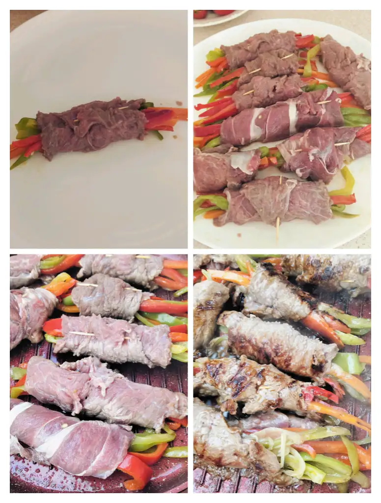Marine biftekleri buzdolabından çıkartıp fazla sosunu süzdükten sonra, 2 tarafını da hafif tuzlayıp iç kısımlarını hazırladığınız iç harçla doldurup rulo şeklinde sarın. Uç kısımlarını pişerken açılmaması için kürdan yardımıyla tutturun.