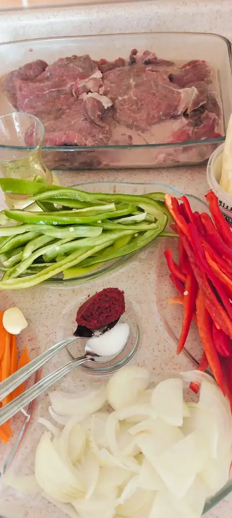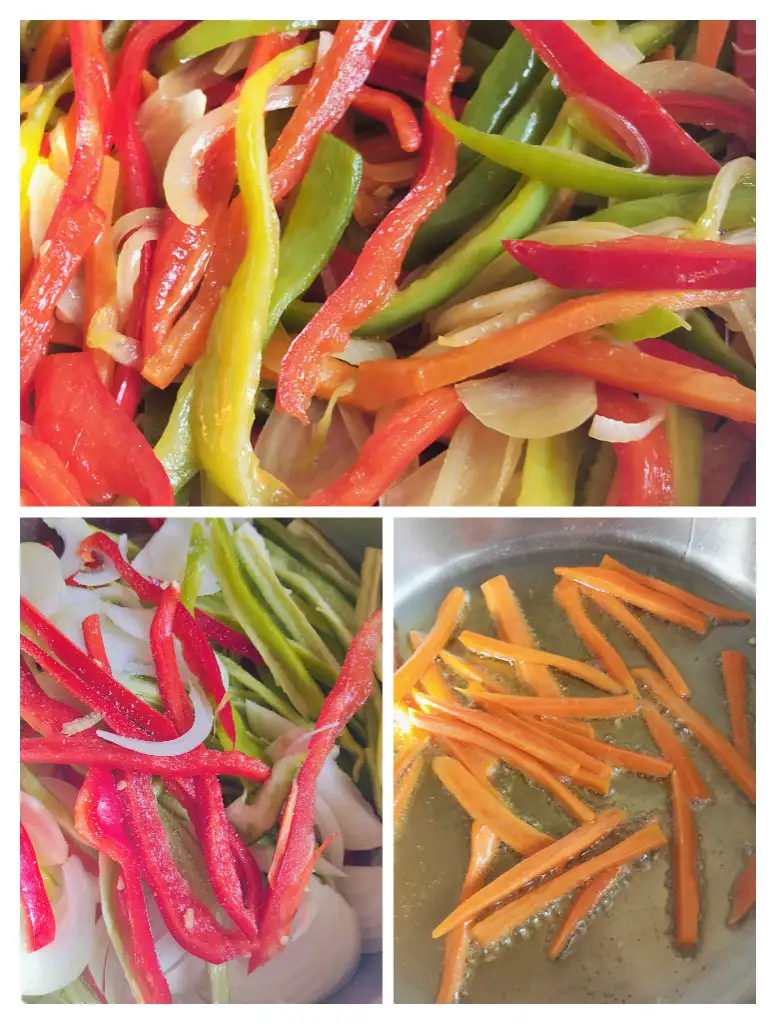 Kabuğunu soyduğunuz havucu, ortadan ikiye kesip çekirdekli kısımlarını çıkardığınız köy biberi ve kapyalı biberi uzun ince şeritler halinde doğrayın.