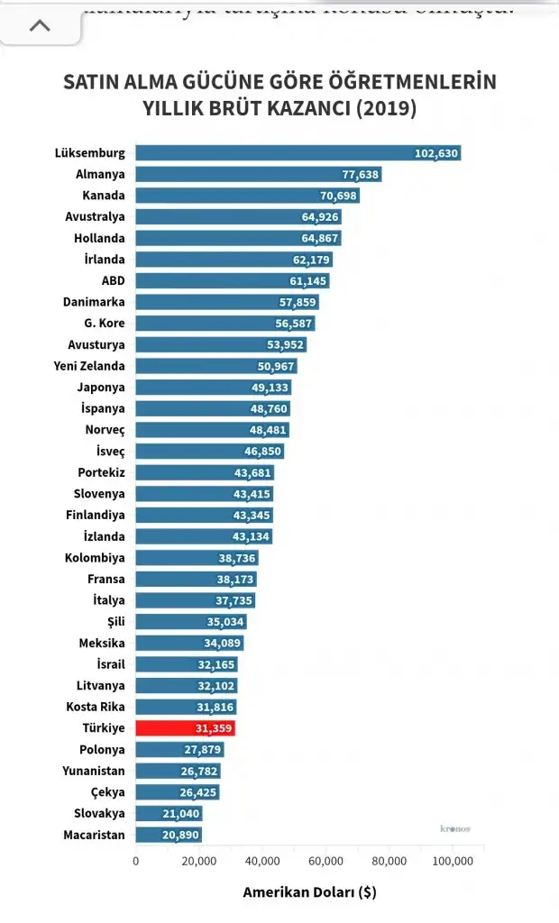 Maaşım yetmiyor dediğimizde hemen "Şükret" diyenler var, asgari ücret şöyle böyle diyenler var. Kıyaslamaya girenler var. Evet asgari ücret çok düşük, ama bu öğretmen maaşının yüksek olduğunu mu gösteriyor? Ben kendimi doktor, mühendis, avukat,savcı, işçi... Hiçbir meslekle kıyaslamıyorum arkadaşım! Ben kendimi o bizi çok kıskanan Avrupa'daki meslektaşlarımla kıyaslıyorum. Şimdi görelim Avrupa'daki öğretmen maaşlarını:
