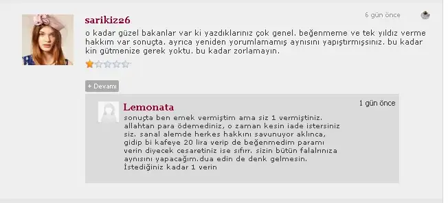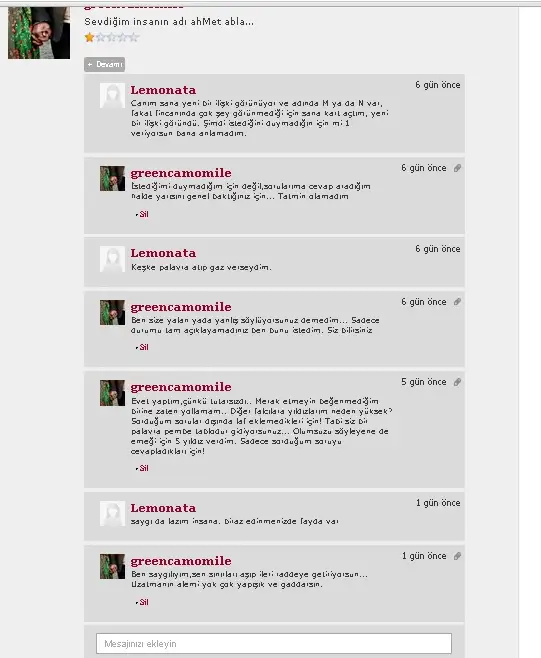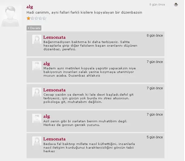 Kızlar ahh başıma gelen... Geçen gün Lemonata'ya fal attım. Sanal hem de... Sorduğum sorunun dışında 5 satır genel yorum yapmış. 3 satır soruma ayırmış. Sorumu yanıtlamadan ssana başka biriyle evlilik var bu yıl içinde.... Tellwe artık gerçekten raydan çıktı. 1 yıldız verdim çünkü tutarlı değildi.. Olumsuz söyleyene 5 yıldız veriyorum halbuki.. Çünkü olayı açıkladıkları için.. Gerçekten beynimi allak bullak ettiler. Laf söylemek için cafede bekliyor beni,sayıyor sürekli.. Kavga da ettim. FORAİN diye bir falcı var,ona da söylemiş fal bakma diye. Sohbette okudum... Ama bana enerjim yok diye iade etti... Böyle kızlar.. Dilerseniz okuyun sayfasındaki yorumlarımı.. İstediğini duymadığın için mi 1 yıldız verdin anlamadım dedi.. Tutarlı olmadığı için yazdım. Keşke palavra atsaydım falan diyor