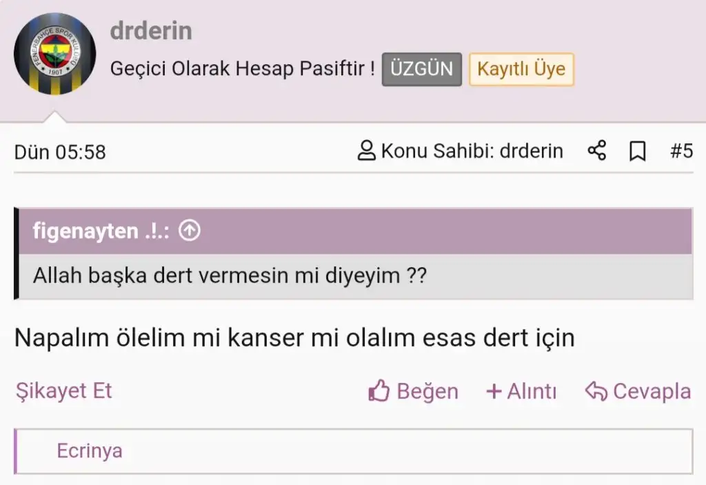 aynen))) Ben cok hassasim boyle konularda. ceza aldigimda, yorumuma sert cevap geldiyinde uzuluyorum. Bir defa yorum yazanlardan biri bana kotu cevap yazmisti. Uzuntuden 5-6 ay siteye girmedim)))Ee yillarin birikintisibiliyolar site sahipleri.. bunye alisti benim etki etmiyor