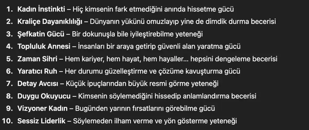 Yapay zekaya sordum, boyle bir liste yapti. Bu da eglenceli mesela ama gercekten 'guc' olan seylerden bahsediyo, asagilayici kliseler degil.