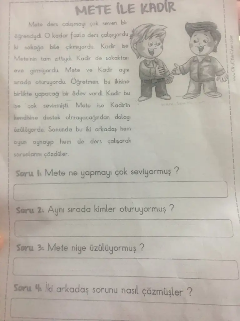 Dün var ya bakın fotokopi ödevi vermiş 2 Metin var birinden 12 soru diğerinden 4 soru cevaplayacak metne göre ( isterseniz resmini atabilirim ödevin )okuduğun parçadan cevaplamaya dair benim yavrum okuyamıyor ben bunu ne yapayım şimdi