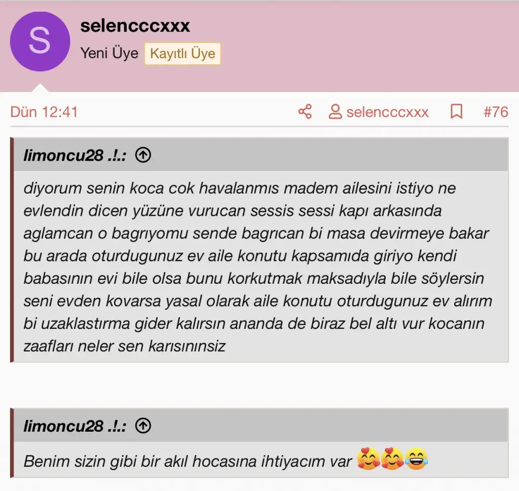 Ezik, karakteri oturmamış bi kocası varsa dayanır sanırım ancakYa bırak şunu bütün yorumları aynı cehalet akıyor. Kendi eşinin ailesine bile arayamaz evime gelemezler eşim gitti mi ixinlerde şu kadar saat kalmak zorunda evde kavga çıkarır diye yorumlarını hatırlıyorum. Kendisi evlilikten bi haber eşine tasma takıp tapuyu aldım kafasında bir üye böylelerine kimse dayanamaz kocası nasıl dayanıyorsa