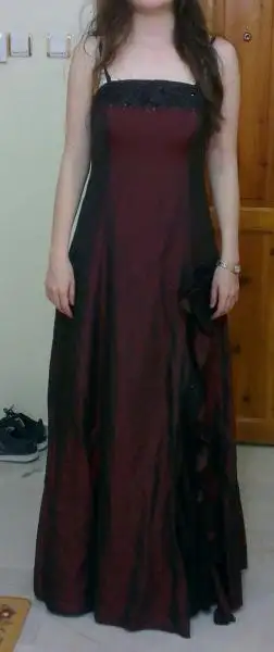 Bordo: Hiç giyilmedi. Tafta kumaş ispanyol tarzı model, yırtmaç yeri açılınca içinden siyah kumaş çıkıyor. Bacak gözükmüyor. Bolerosu da var. 75 tl