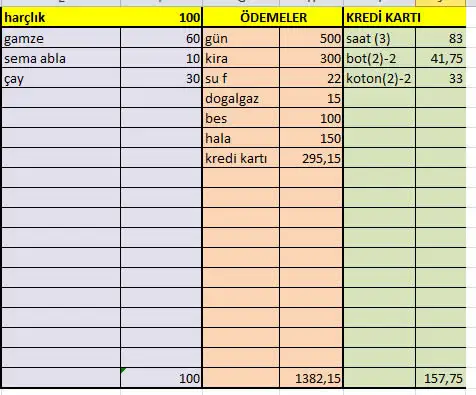 excel dosyası hazırladım. her ay yeniliyorum güzel oluyor nereye ne harcamışım biliyorum en azından öneririmamin amin canım bereketimiz bool olsun inşaallah :))