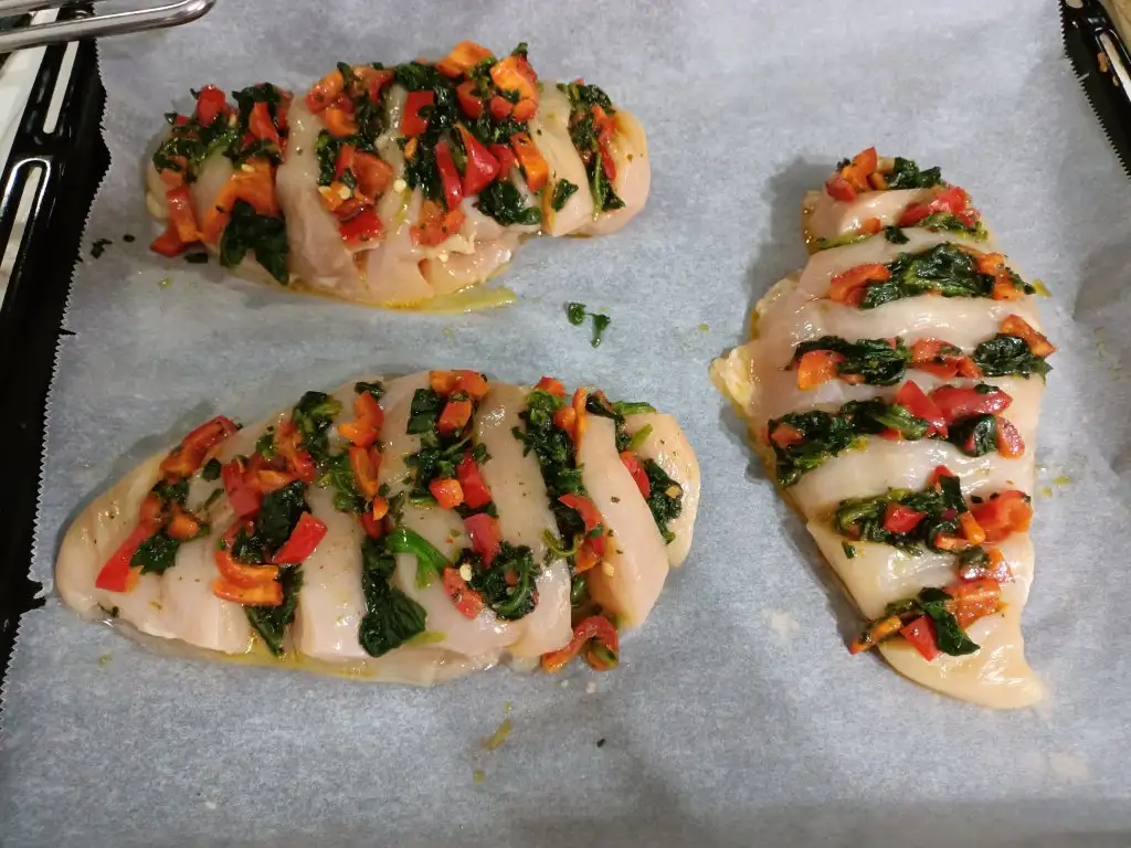 Akşam yemeğine değil ama gündüz gelecekler gün gibiBugün herkese aynı yemeği öneriyor gibi olacağım ama. Ispanaklı kapıya biberli bi tavuk denemiştim, fırında yapıldığı için çok az yağ kullanılıyor hem şık hem doyurucu hem de sağlıklı oluyor. Şu pişmemiş hali