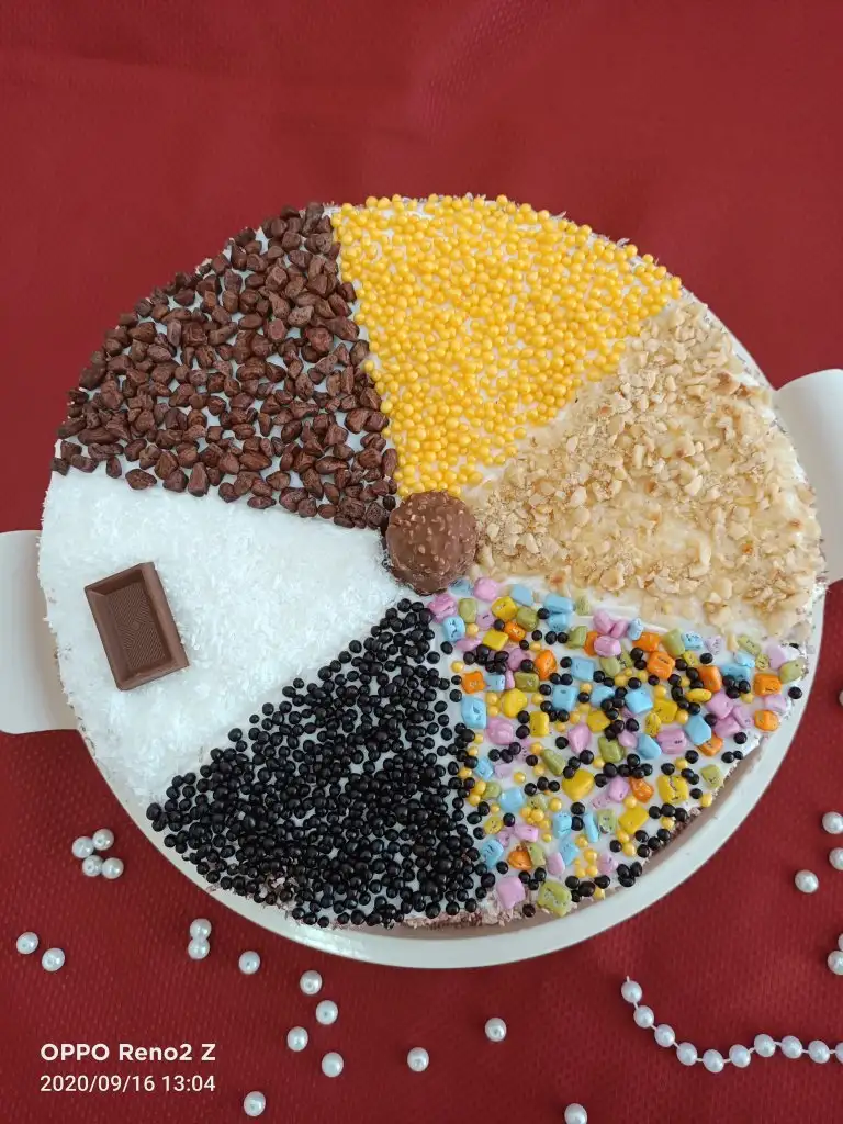 Süsleme boncukları, bitter çikolata, hindistan cevizi, çakıl taşı çikolata, fındık vs.