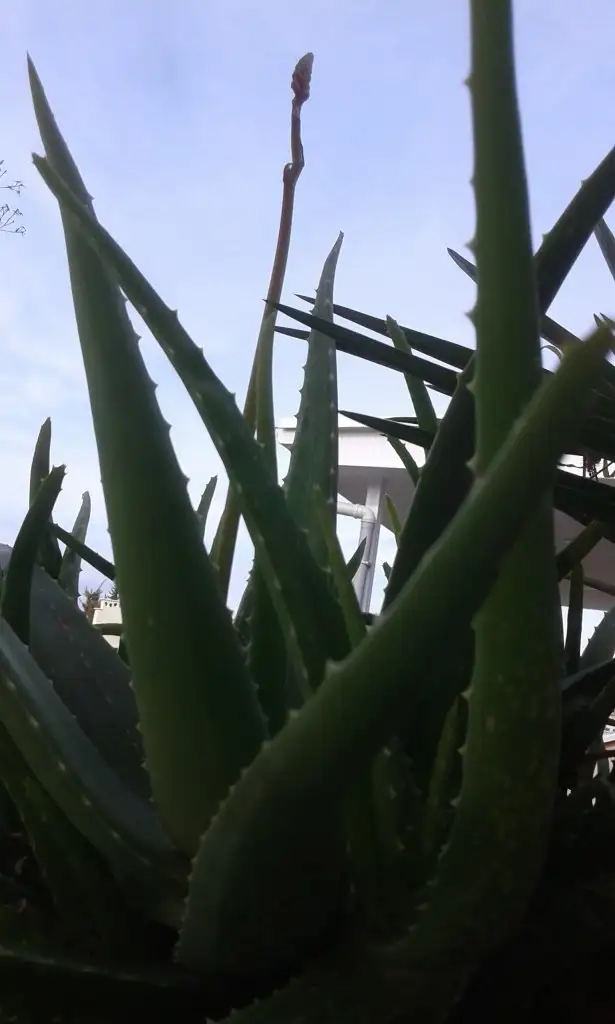 Bu saksıda nereden baksanız 10-15 kök aloe vera var. 2. Fotoğrafta gördüğünüz ortadan çıkan uzun sap çiçek, tomurcuklanmış yakın zamanda açacak.