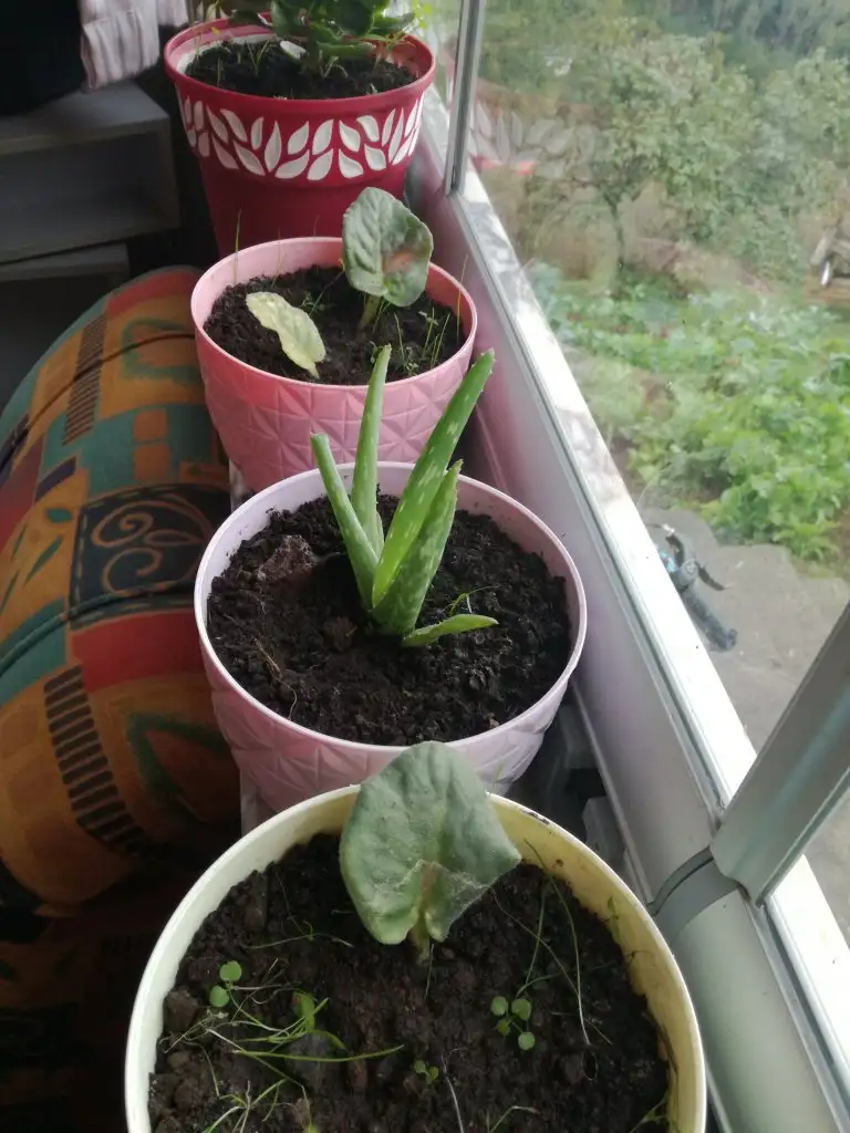 Sıradan bir toprakla sıfır gübreyle, toprak kurudukça suladığım bitki saksılar dolusu yeni aloe veralar verdi, fotoğrafta gördüğünüz aradan çıkmış sivri yapraklarda palmiye hurması fidesi, Ramazan'da marketten aldığım hurmaların çekirdeklerini saplamıştım, kendi kendilerine filizlenip fide haline geldiler