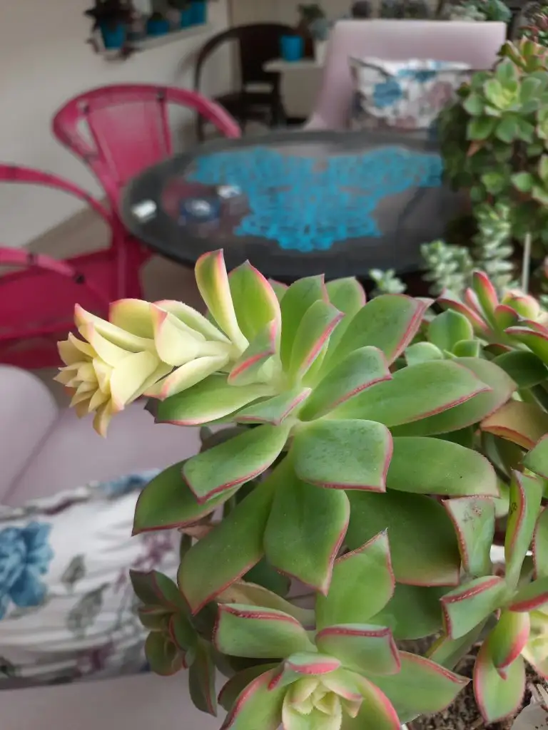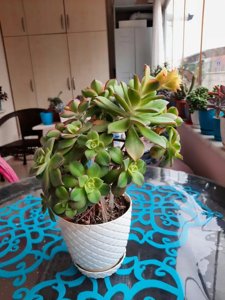aoenium kiwi çiçeğe durdu, bu bitkinin çiçek açan dalı ölüyor. Bitki hemen hemen 5 yaşında, geçen yıl da bir dalı ölmüştü. Yaşlanan dallardan böyle kurtuluyor galiba.