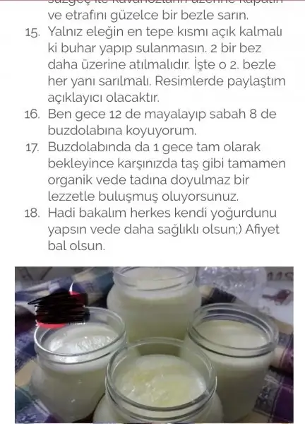 Canım yoğurt peynir labne tariflerini resim olarak eklersen ilk mesajımıza ekleyelim kolay olsun sonradan da bulması. Ben tlfndan düzenleme yapamıyorum pek ondan kopyalayamadım. :)Dün akşam büyüyo marka probiyotik maya ile sek günlük süt ve köy sütü ile ayrı ayrı BLW Türkiye sayfasındaki tarife göre yoğurt mayaladım.Sabah taş gibiydi. Yarın yemek için sabırsızlanıyorum.