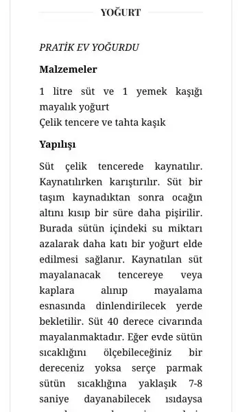 • 1 litre süt 40 derece civarı sıcaklığa getirilir. (Parmağımız 7, 8 saniye dayanacak kadar.)