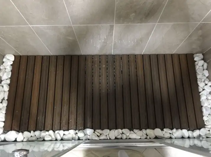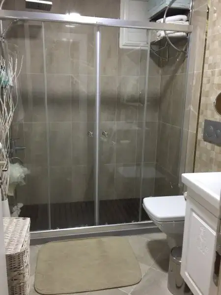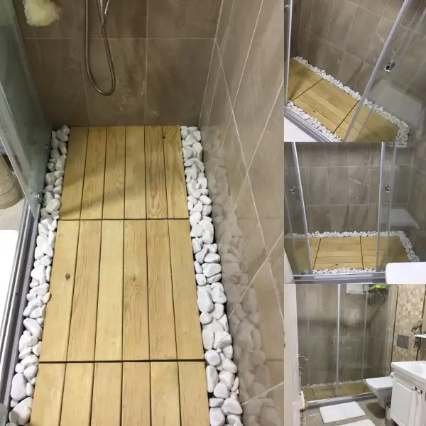 Banyoda dus zemini duvarlarla ay i ton fayansti, kayiyorsun kotu gorunuyor hic haz etmedim. Zeminde bir iki kucuk islem yapalim istedik, once tum zemini abdesthanelerdeki plastik karolarla kapladik, sonra uzerine teknelerde kullanilan ahsap karolardan dizip kalan bosluklari dolamit taslariyla doldurduk. Ama bir sure sonra ahsaplar islak kaldigi ve banyo yeteri kadar havalanamadigi icin koku yapmaya basladi, o zaman da yerine ahsap gorunumlu pvc kaplamarla yeniledik. Aradigimiz yon bulamadik ne yazikki koyu kahve olarak mumkun oldu sadece...