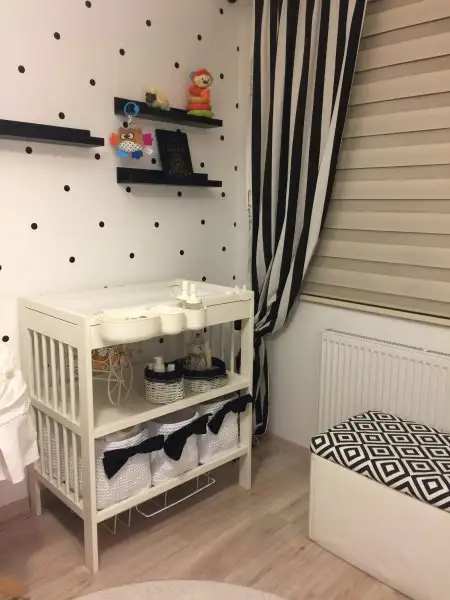 Bebegimin odasinda da arastirmalarim sonucu ogrendigim bebeklerin ilk 3 ay sadece siyah beyaz renkleri ve geometrik sekilleri gordugu, bu tur dekorasyonlarin zeka gelisimine olumlu etki ettigi... renkler guzel olunca odayi bastan sons siyah beyaz yaptik. Heryeri beyaza boyadik once. Sonra bir duvar icin kalip cikartip 1 tl ile siyah sticker dan yuvarlaklar kesip puantiyeli duvar yaptik. Perdeler, yatak tekstili yine tarafimdan dikildi:)