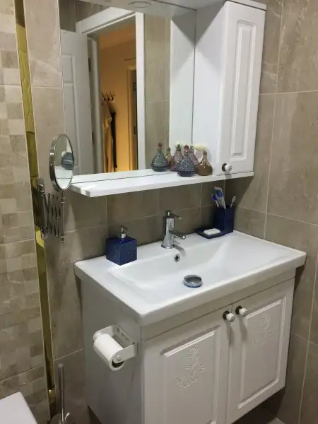 Banyoda dus zemini duvarlarla ay i ton fayansti, kayiyorsun kotu gorunuyor hic haz etmedim. Zeminde bir iki kucuk islem yapalim istedik, once tum zemini abdesthanelerdeki plastik karolarla kapladik, sonra uzerine teknelerde kullanilan ahsap karolardan dizip kalan bosluklari dolamit taslariyla doldurduk. Ama bir sure sonra ahsaplar islak kaldigi ve banyo yeteri kadar havalanamadigi icin koku yapmaya basladi, o zaman da yerine ahsap gorunumlu pvc kaplamarla yeniledik. Aradigimiz yon bulamadik ne yazikki koyu kahve olarak mumkun oldu sadece...