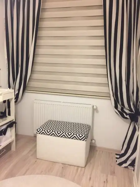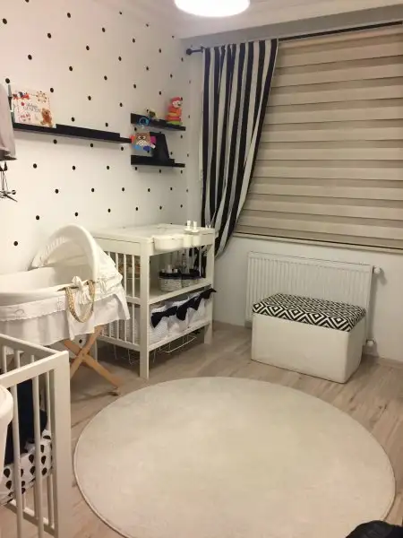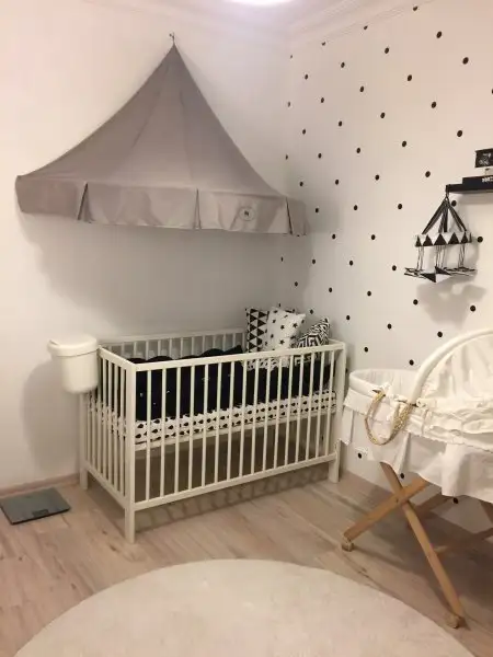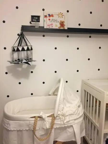 Bebegimin odasinda da arastirmalarim sonucu ogrendigim bebeklerin ilk 3 ay sadece siyah beyaz renkleri ve geometrik sekilleri gordugu, bu tur dekorasyonlarin zeka gelisimine olumlu etki ettigi... renkler guzel olunca odayi bastan sons siyah beyaz yaptik. Heryeri beyaza boyadik once. Sonra bir duvar icin kalip cikartip 1 tl ile siyah sticker dan yuvarlaklar kesip puantiyeli duvar yaptik. Perdeler, yatak tekstili yine tarafimdan dikildi:)