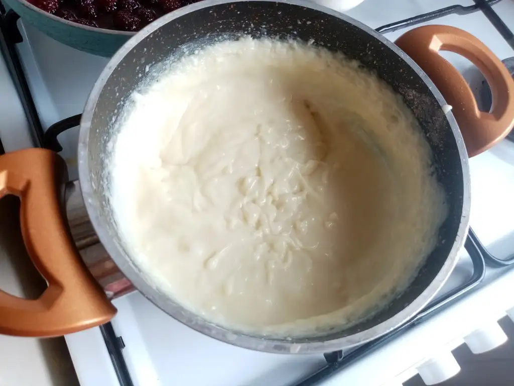 Krema Malzemelerimizi bir tencere de karıstırıp ocaga alıyoruz. Diğer taraftan böğürtlen ve şekerimizi başka bir tavada ocaga alıyoruz. Pişene kadar bekliyoruz.