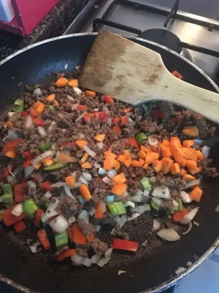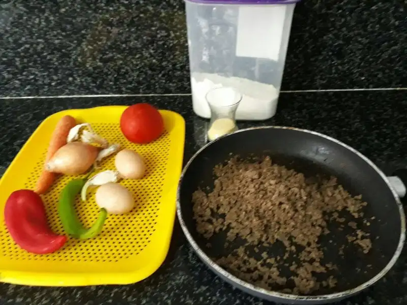 300 gr kavrulmuş kıymaya küçük küçük doğradığımız biberleri,soğanları ve havucu ekleyip kavuralım.. sonrasında 2 kaşık salçasını ekleyip kavurmaya devam edelim.. en son doğradığımız bi domates ve sarımsak ezmesini ekleyelim.. tabi tuz ve karabiberde.. kapağını kapatalım..