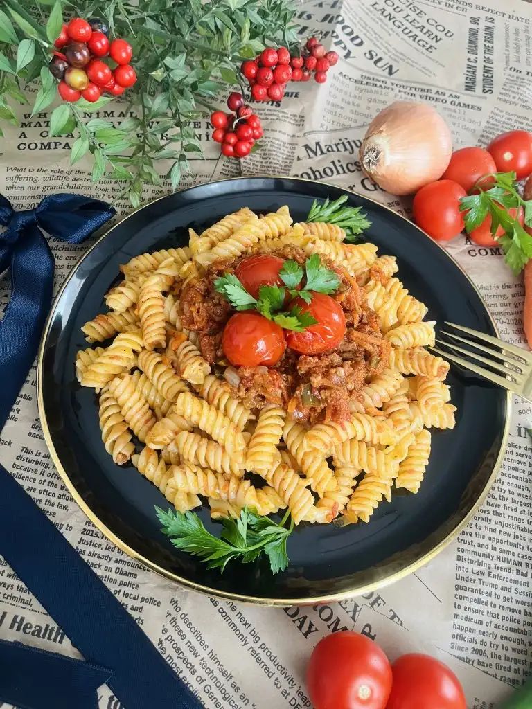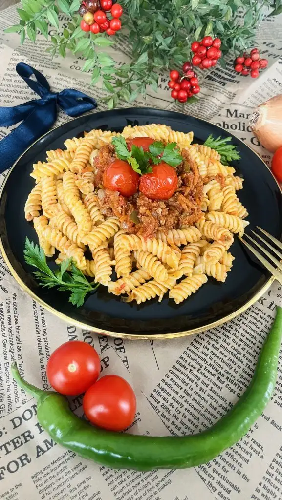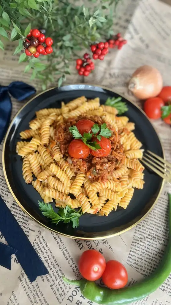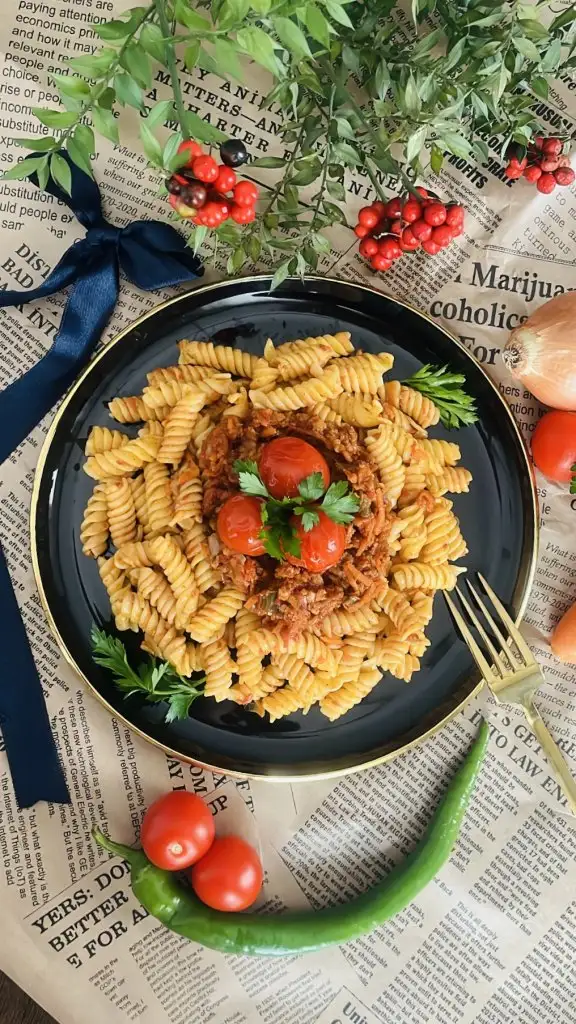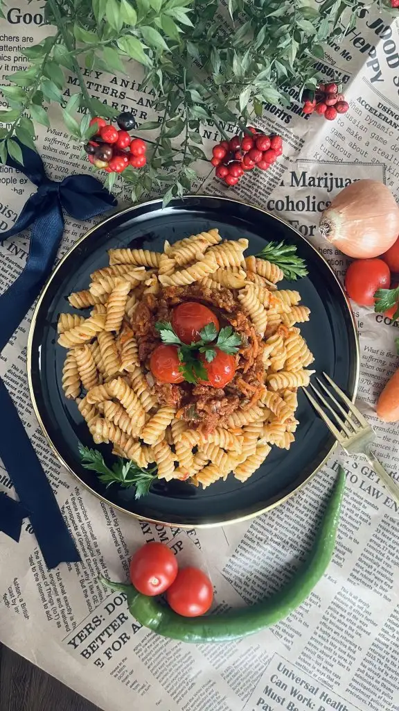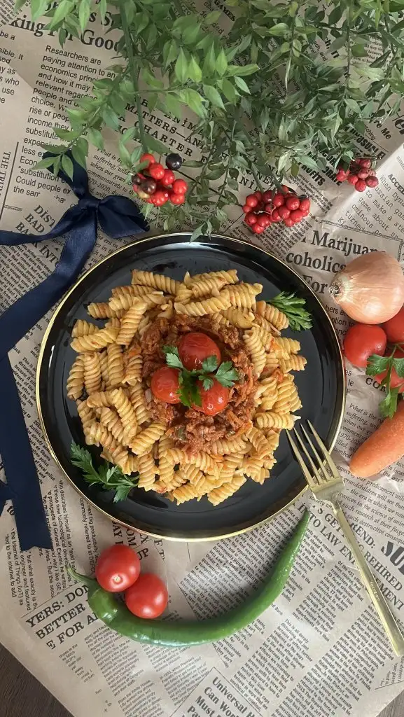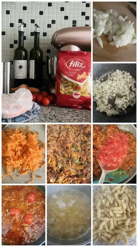 Yapılışı: Derin bir tencereye sıcak su koyun. Üzerine biraz tuz serpin. Makarnaları ekleyip, yumuşayana kadar haşlayın. Sonra süzüp kenara alın. Diğer yandan 1 adet soğanı, 2 diş sarımsağı ince ince doğrayın. Havucu da rendeleyin. Bir tavaya 3 yemek kaşığı zeytinyağ koyun. Üzerine 1 adet ince ince doğranmış soğan ve sarımsağı da ekleyin. 2-3 dakika kadar kavurun. Rendelenmiş havucu ve kıymayı ekleyip kavurmaya devam edin. Konserve domates sosunu ve baharatları da ekleyip biraz pişirin. Ben sos pişerken 2-3 tane çeri domatesi de ekledim. Hem lezzet, hem görsellik için. Sosun bir kısmını tenceredeki makarnayla karıştırın. Bir kısmını da servis ederken üzerine koyun.