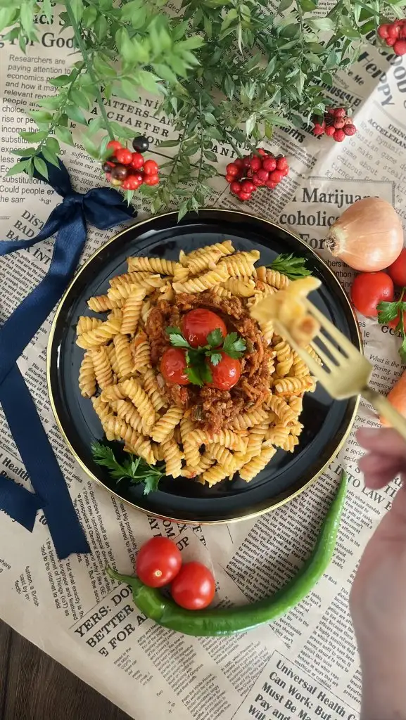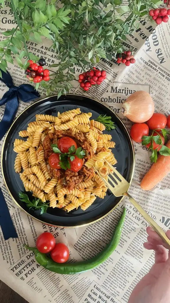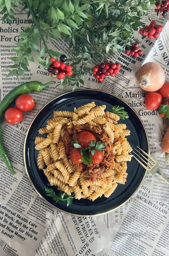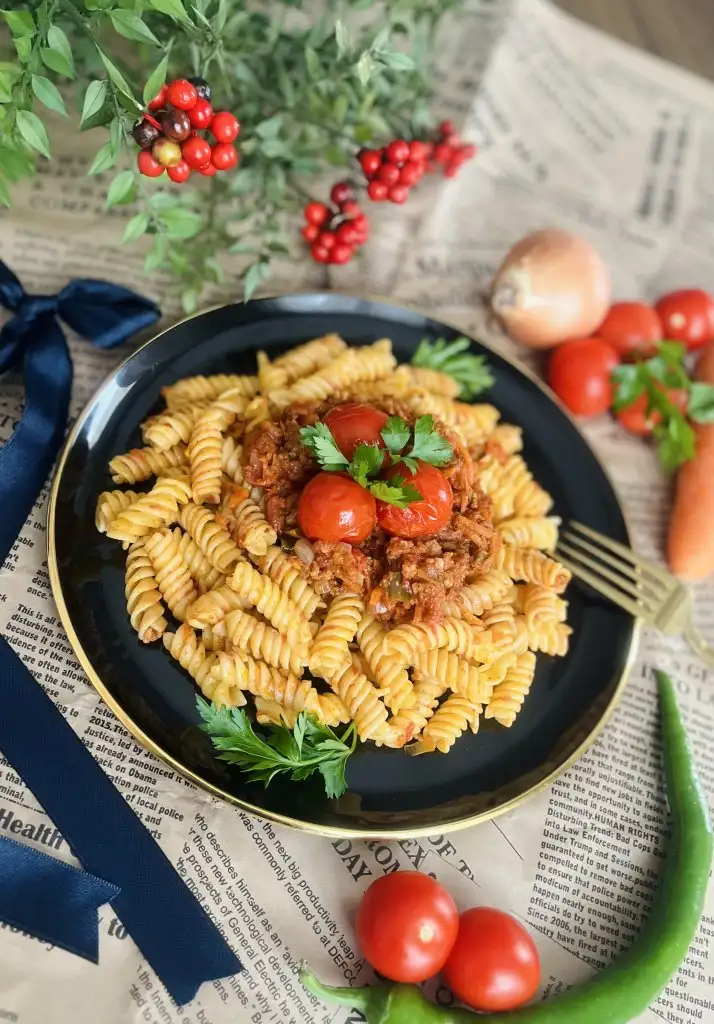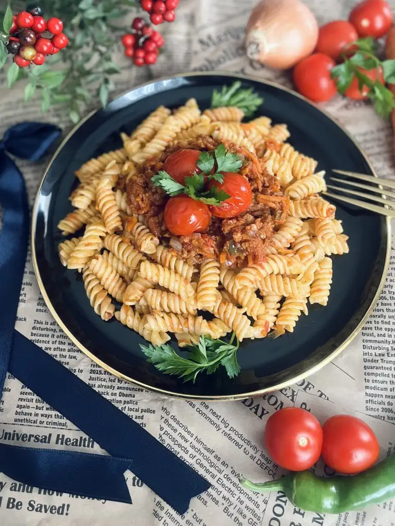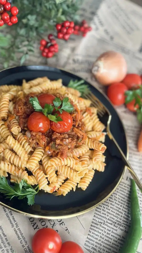 Yapılışı: Derin bir tencereye sıcak su koyun. Üzerine biraz tuz serpin. Makarnaları ekleyip, yumuşayana kadar haşlayın. Sonra süzüp kenara alın. Diğer yandan 1 adet soğanı, 2 diş sarımsağı ince ince doğrayın. Havucu da rendeleyin. Bir tavaya 3 yemek kaşığı zeytinyağ koyun. Üzerine 1 adet ince ince doğranmış soğan ve sarımsağı da ekleyin. 2-3 dakika kadar kavurun. Rendelenmiş havucu ve kıymayı ekleyip kavurmaya devam edin. Konserve domates sosunu ve baharatları da ekleyip biraz pişirin. Ben sos pişerken 2-3 tane çeri domatesi de ekledim. Hem lezzet, hem görsellik için. Sosun bir kısmını tenceredeki makarnayla karıştırın. Bir kısmını da servis ederken üzerine koyun.