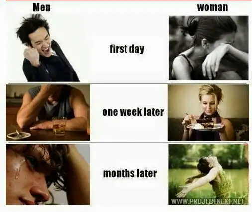 Bence birbirine zıt orantida islior bu gidiş. Kadin baslarda zayifken, duygusalken zamanla bunu yeniyor, güçleniyor, ve üstesinden gelerek yeni bi hayata başlıyor. Erkekse ilk zamanlarda biraz gurjrdan biraz oh canima degsin modundan daha rahat görünüyor, bekarlık sultanlik psikolojisine giriyor, ama zamanla icine öküz oturuyor. Öküzün icine öküz oturumu demeyin olabilior. Ama is işten gecmis oluyor. Sonra öyle kırık dökük halde ziyan oluyor. Bir süre sonra ise hayat deyip akışa katiliyor. Bnm gözlemlerim gnlde bu yönde. ..